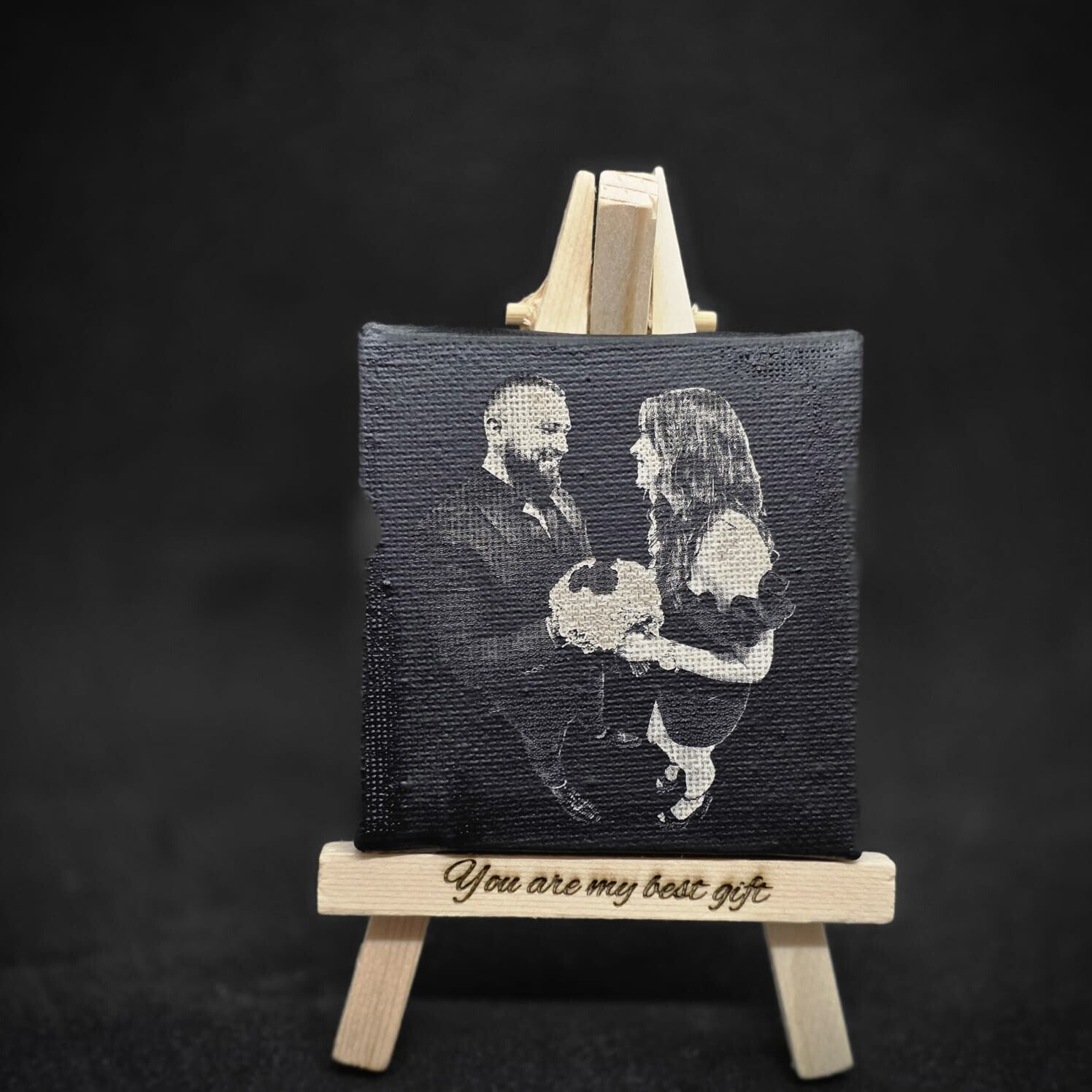 Maak een speciaal moment blijvend met dit mini canvas op houten schildersezel, voorzien van een fijn gegraveerde zwart-wit foto.